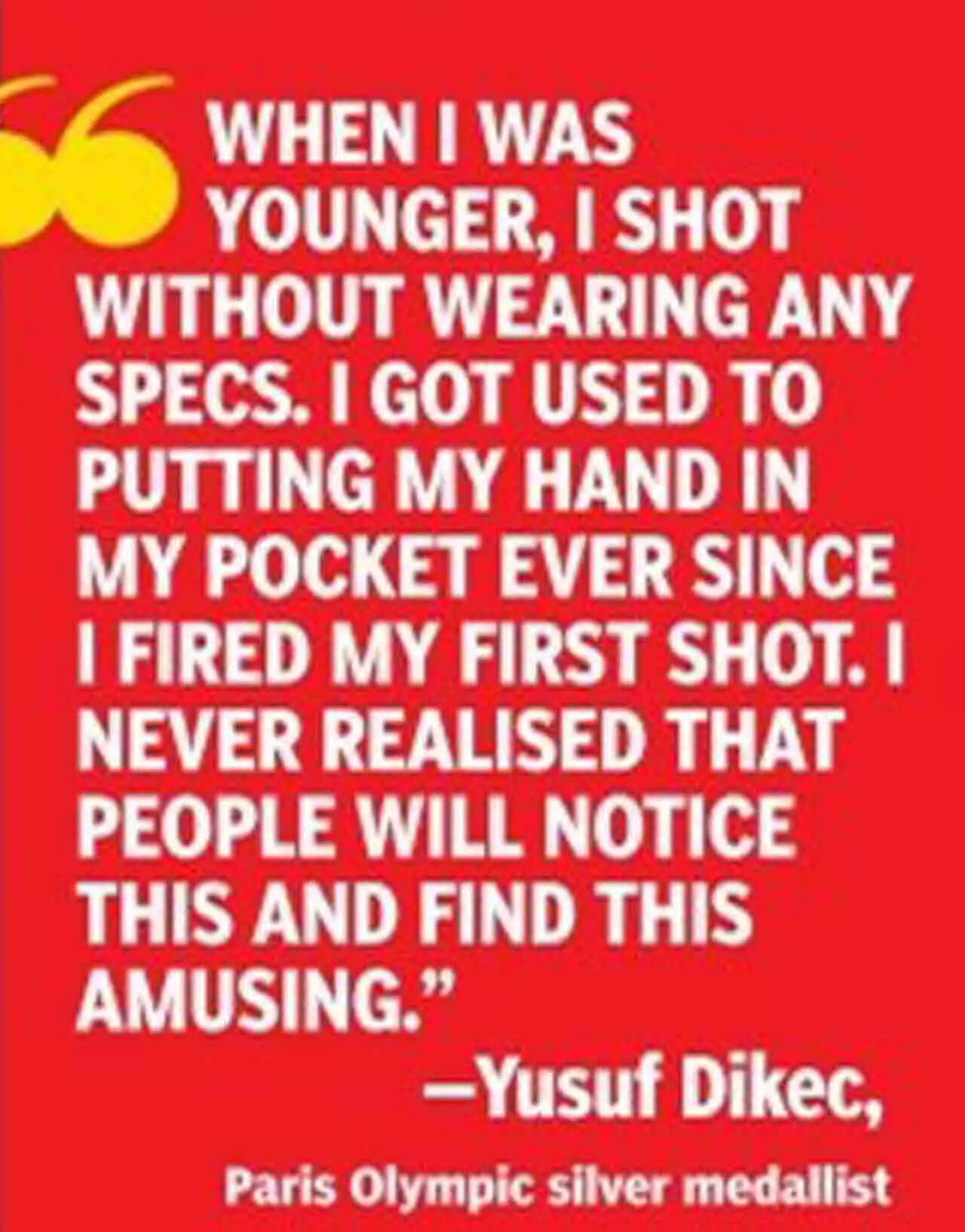 On not using any shooting gear, Dikec said: "I like to keep things as simple as they can be. I find these specs better than the complicated gear. When I was younger, I shot without wearing any specs. I got used to putting my hand in my pocket ever since I fired my first shot. I never realised that people will notice this and find this amusing."