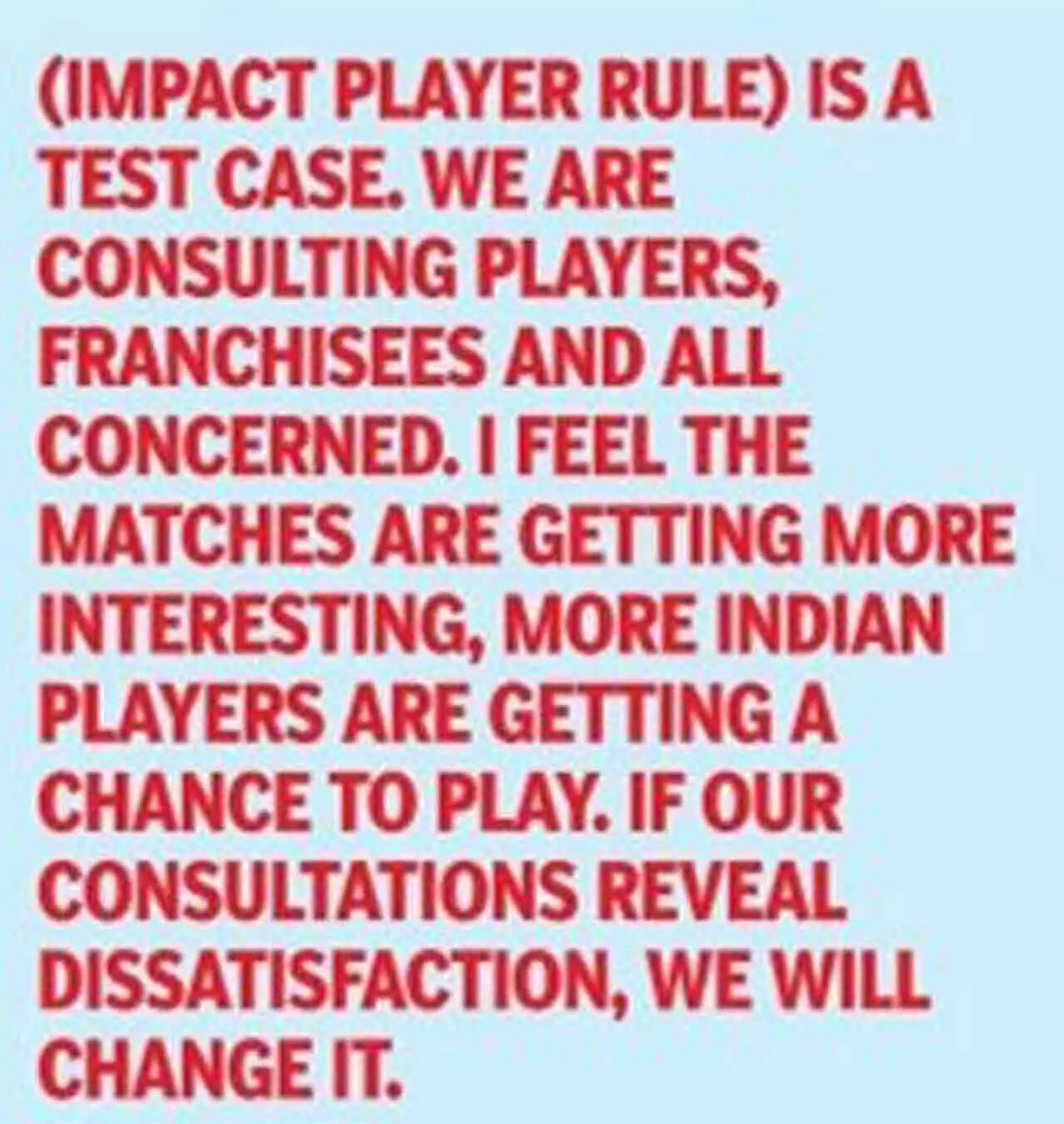 Asked about the criticism of IPL's impact player rule by several former and present cricketers, Shah replied, "It's a test case. We are consulting players, franchisees and all concerned. I feel the matches are getting more interesting, more Indian players are getting a chance to play. If our consultations reveal dissatisfaction, we will change it."