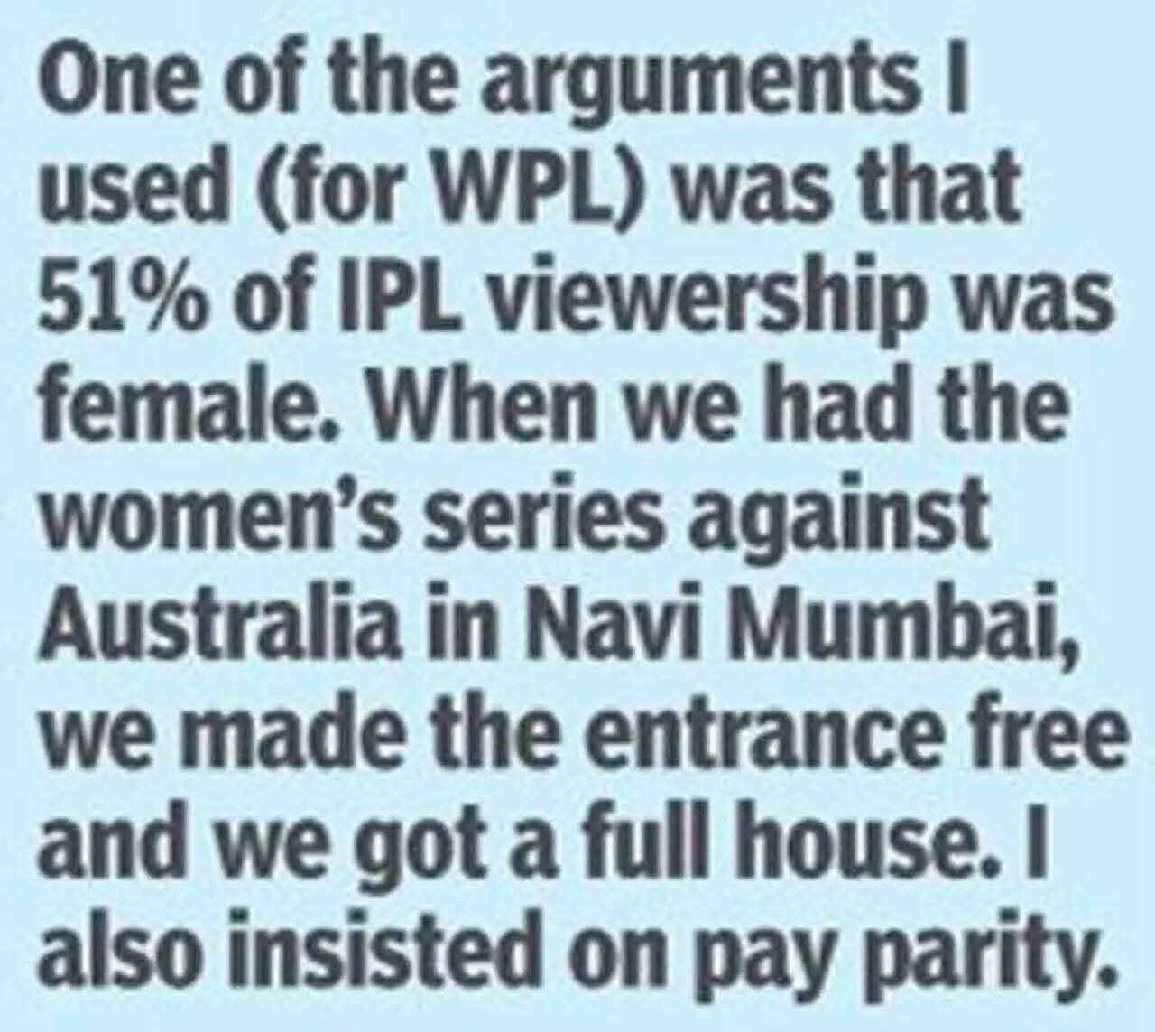 When I decided to create WPL (Women's Premier League), I had a lot of convincing to do. One of the arguments I used was that 51% of IPL viewership was female. When we had the women's series against Australia in Navi Mumbai, we made the entrance free and we got a full house. I also insisted on pay parity because this would encourage women to come out and play. After my decision, I am glad to inform you that ICC also announced pay parity in prize money for the Women's World cup. We have also introduced a sports psychologist for the women's team and hired Amol Mazumdar as a dedicated coach for them.