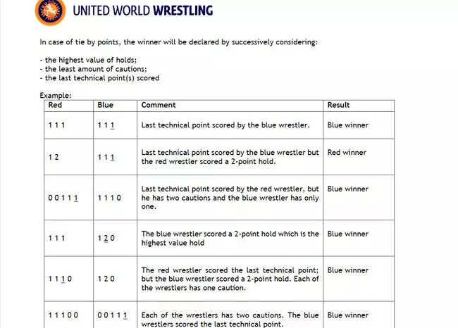 According to the United World Wrestling (UWW) rules, in case of tied scores after a bout, the winner is decided on the basis of three criteria.