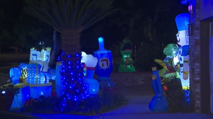 The house, clearly decorated with illuminated Jewish symbols and 'Happy Hanukkah' signs, was targeted shortly after the family returned home from dinner. Authorities say the suspect shouted antisemitic slurs before fleeing the scene, and as of the latest update, no arrest has been made.