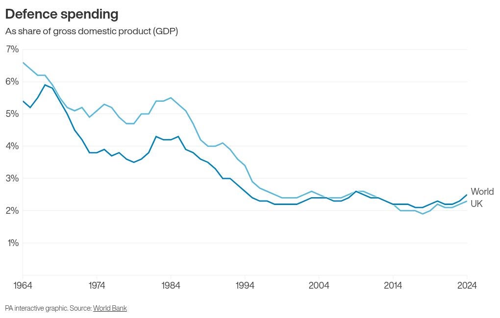 Data from the World Bank shows that during the last 40 years of the 20th century UK defence spending dropped significantly as a proportion of GDP.