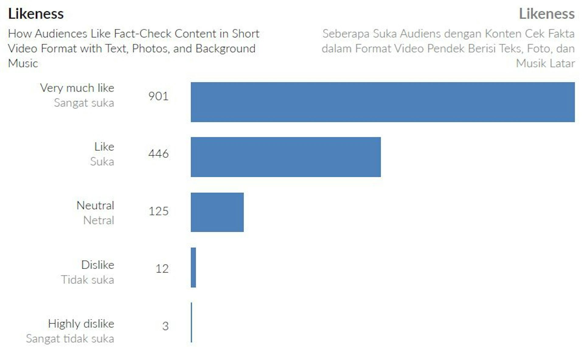 As many as 901 respondents (60.6%) revealed that they “very much like” fact-checking content in the form of short videos accompanied by text, photos and background music.
