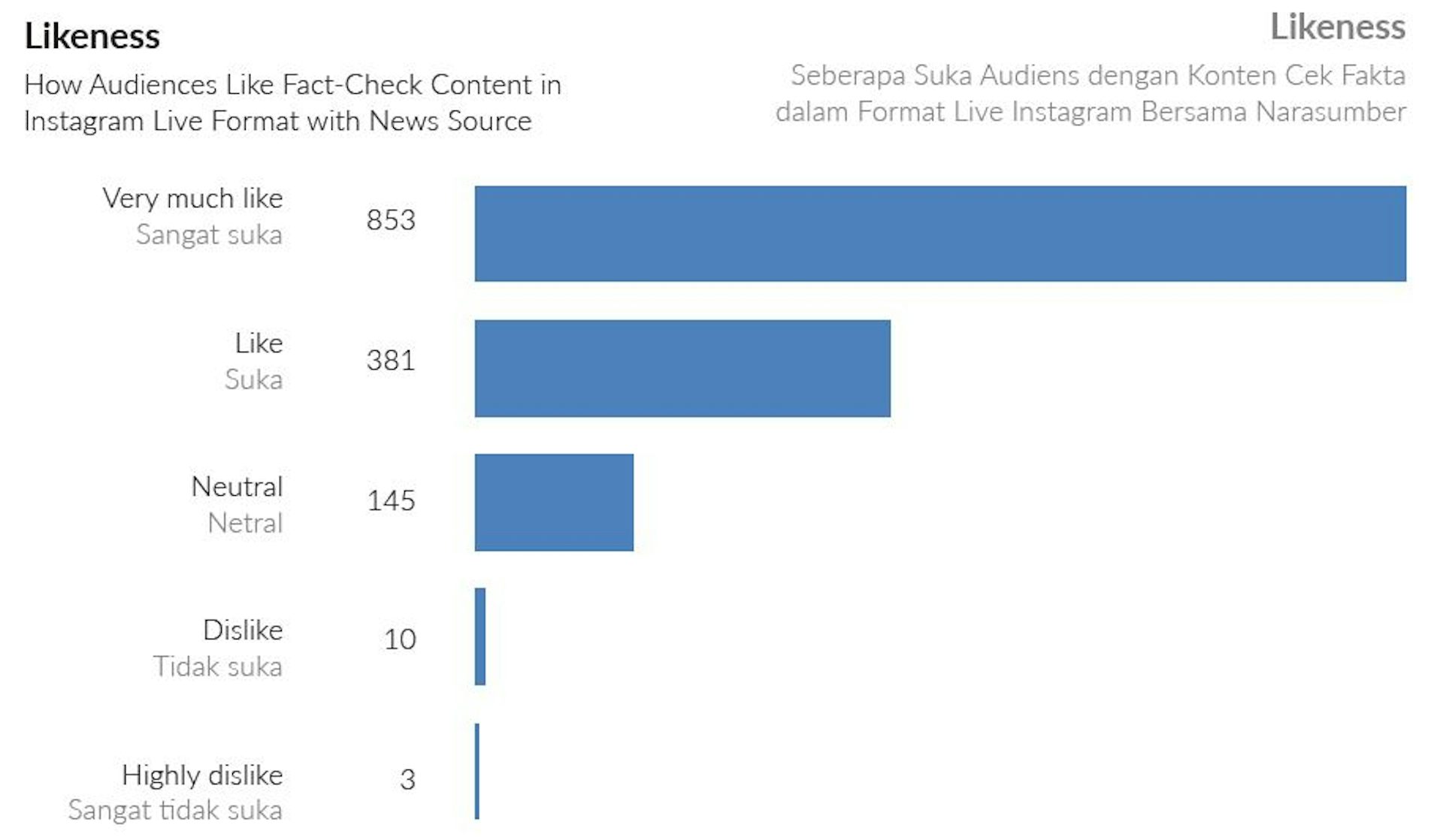 Up to 853 respondents (60.8%) stated very much liked fact checks in the form of live Instagram posts. Both fact-check formats, short videos with background music and live Instagram, are preferred over lengthy fact-check texts. The comparison of audience choices can be seen in the following graphs.