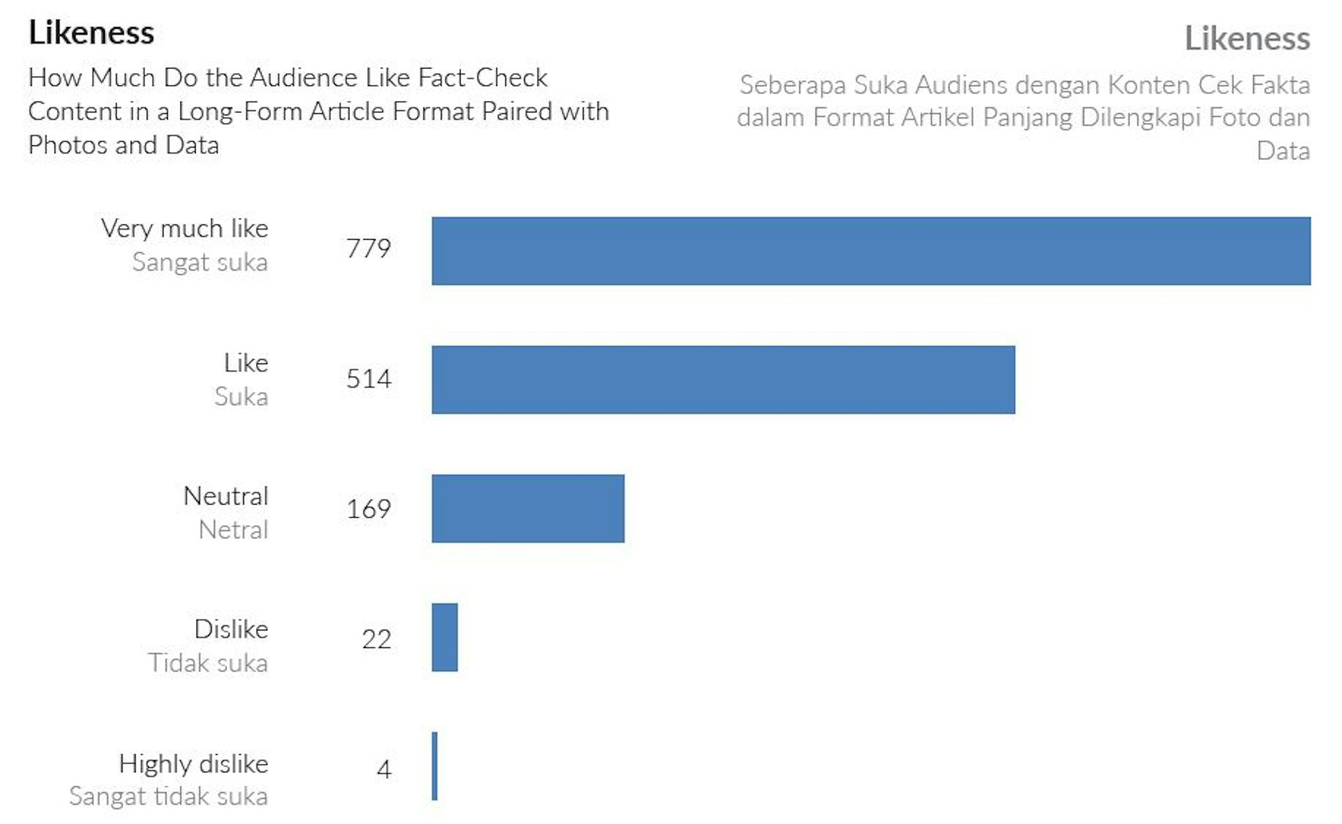 One of the interesting results is that while 49% find that text fact-checks are useful, they do not actually like them. Audiences in Indonesia prefer the fact-check formats dominated by visual elements, either videos or photos.