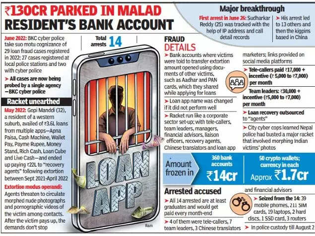 Cops said the arrested accused would park the extortion money into these accounts. These funds would then be converted into cryptocurrency and transferred to China. Police said of the Rs 350 crore, around Rs130 crore alone was received through 'Cash Free' app operated by Malad's Sneha Somani who was in charge of disbursing loans.