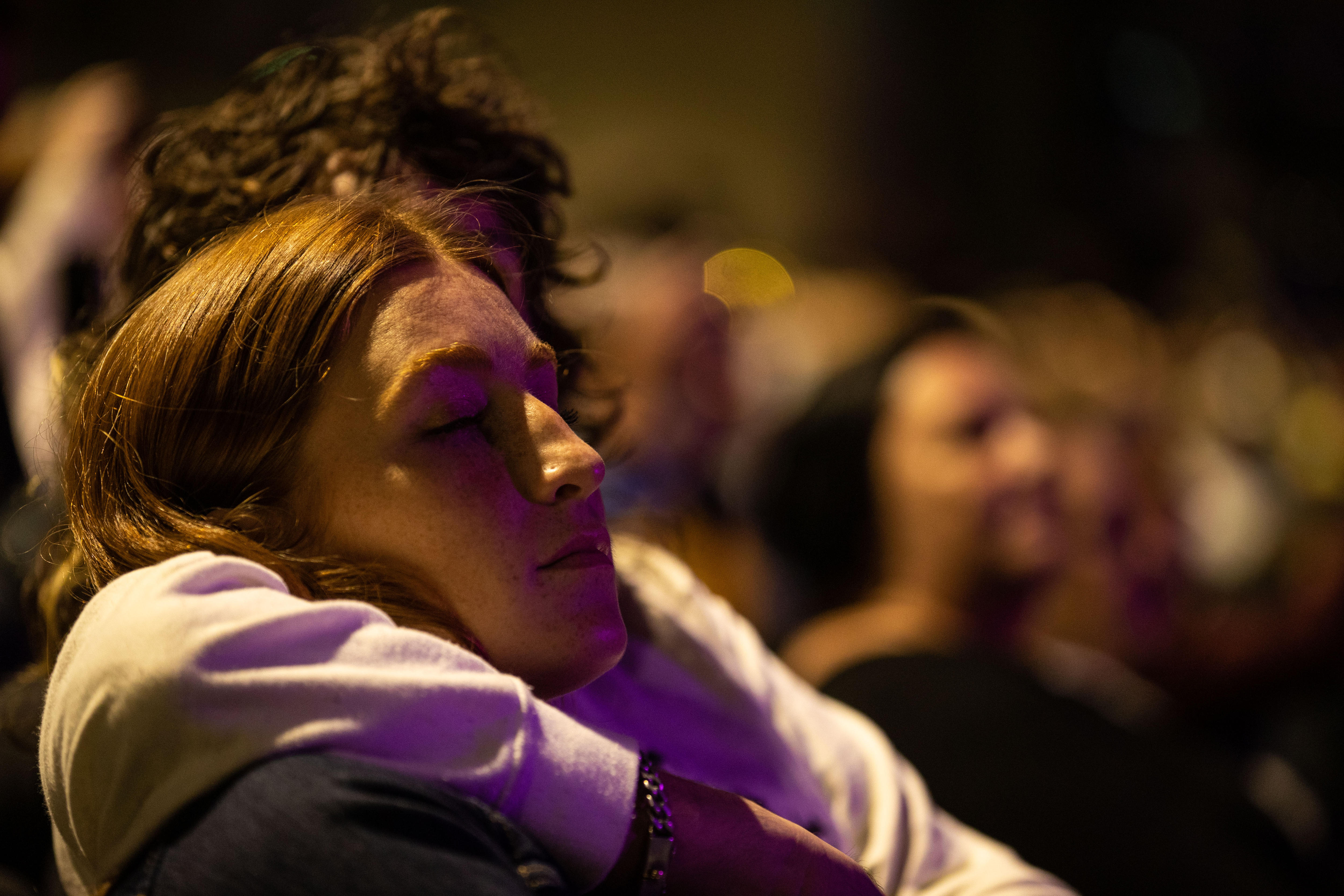 Camille Hugh closes her eyes to listen to Stevens's rendition of INXS classic Never Tear Us Apart.