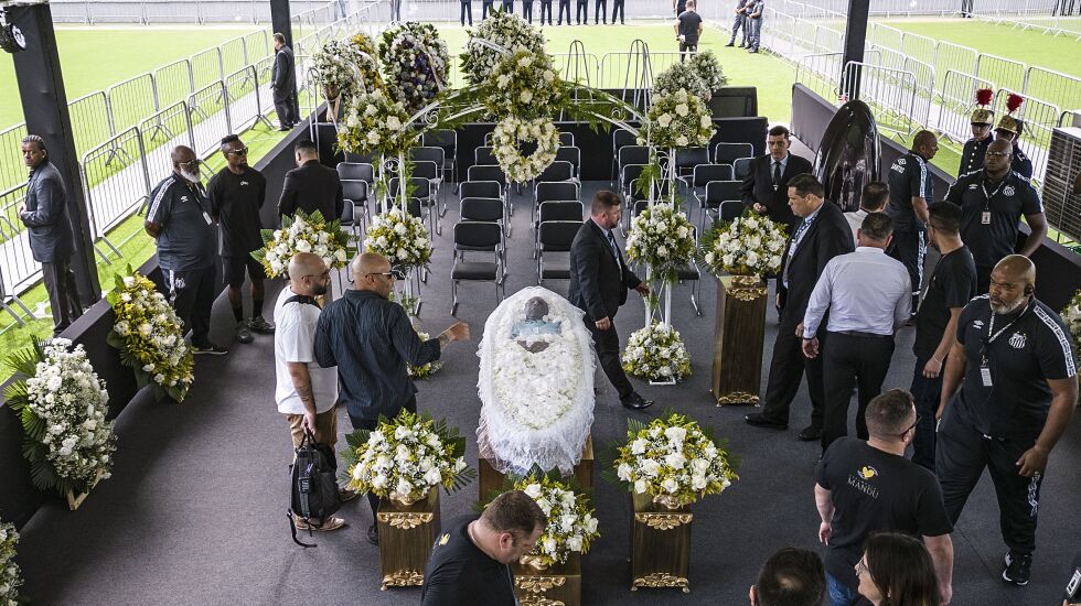 Pelé’s coffin was placed on the field where he scored scored some of the best goals of his career. Mourners walked past his casket in the 16,000-seat stadium outside Sao Paulo. His burial will take place in a cemetery only 600 meters away on Tuesday.