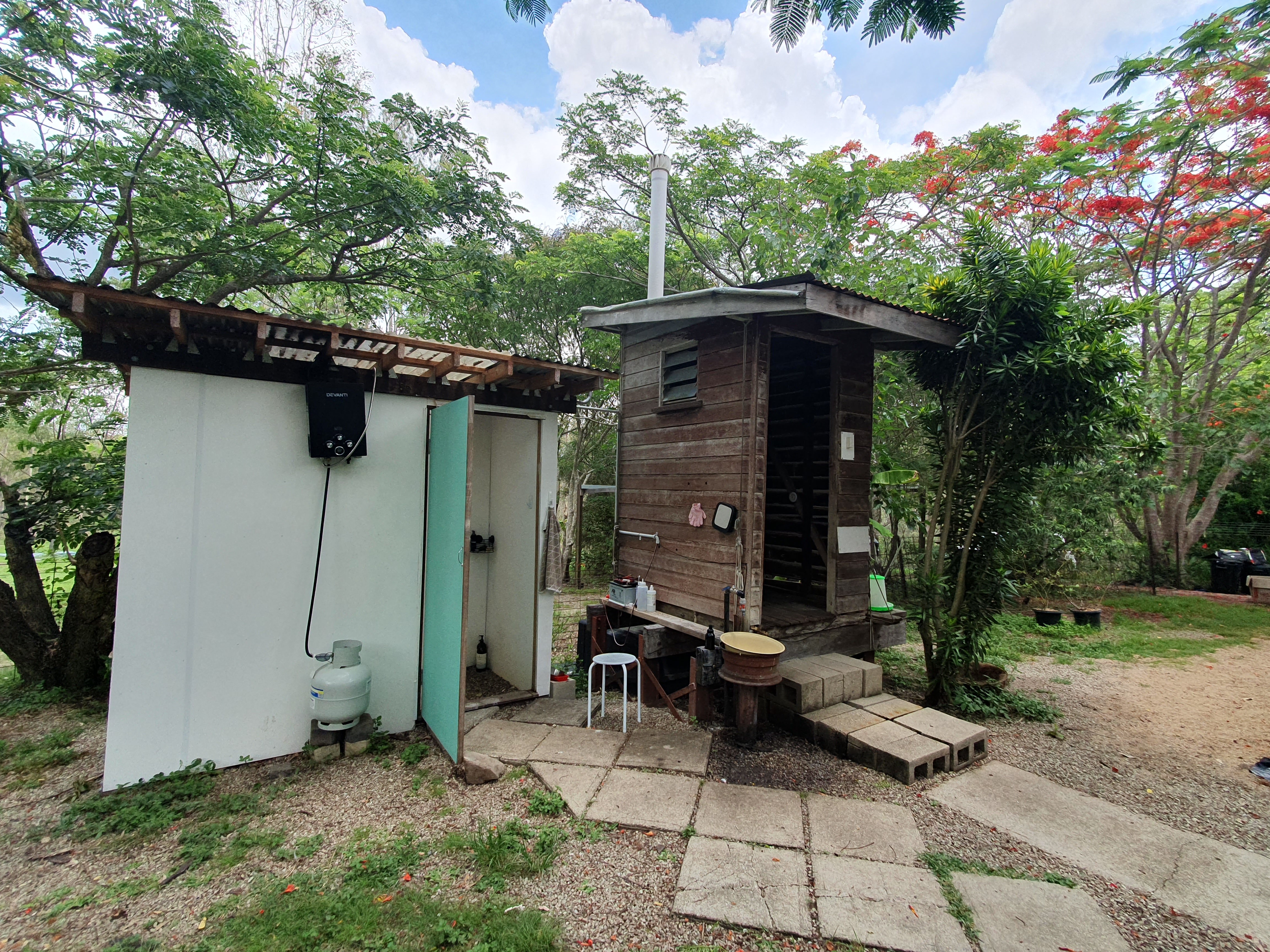 The drop toilet has no flushing capacity but uses pine shavings and buckets of leaves to help break down the compost, with a whirly bird attached to the outhouse to help aerate and eliminate odours.