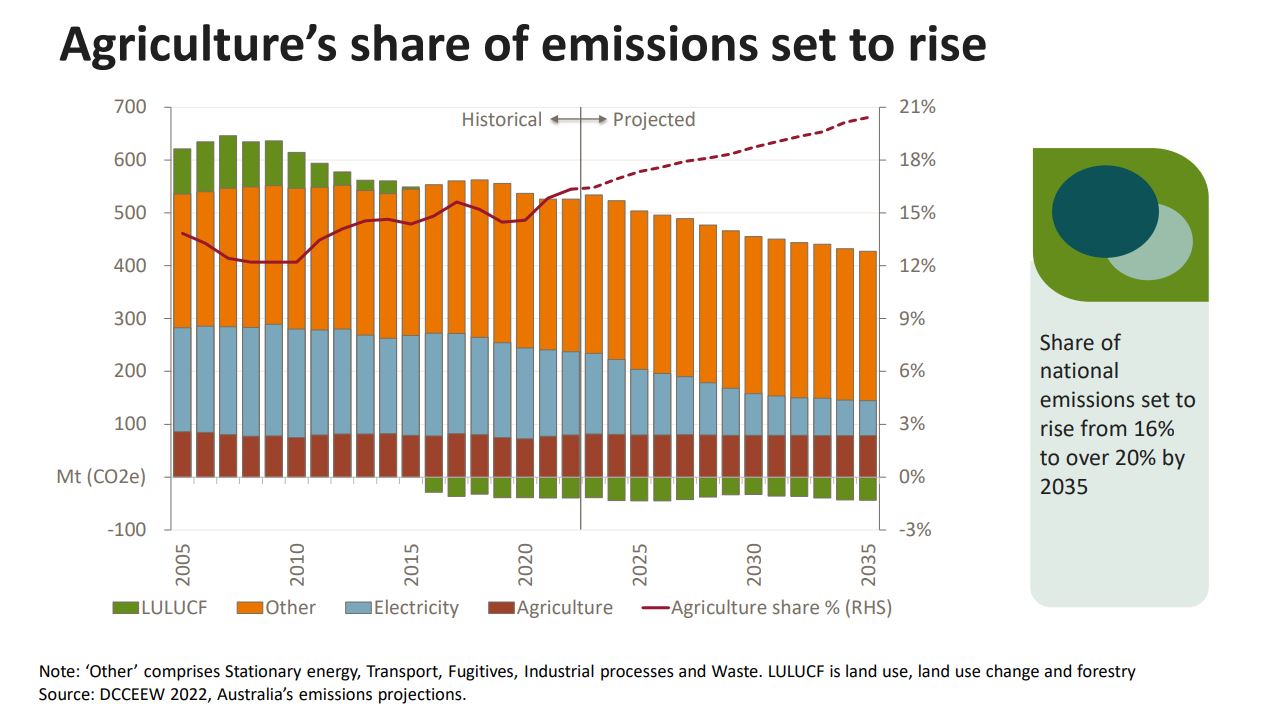 Australian government figures show agriculture produces 16 per cent of the country's greenhouse gas emissions, which is set to rise to more than 20 per cent by 2035.