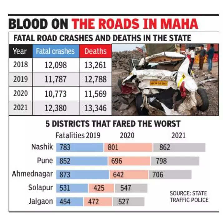 Over 12,300 fatal crashes were reported across the state last year in which more than 13,300 people died, according to latest data with the state traffic department. Nashik and Pune were the two districts that fared the worst in terms of fatalities. But a silver lining for Mumbai was that deaths dropped by 36% to 288 in 2021 from 447 in 2019.