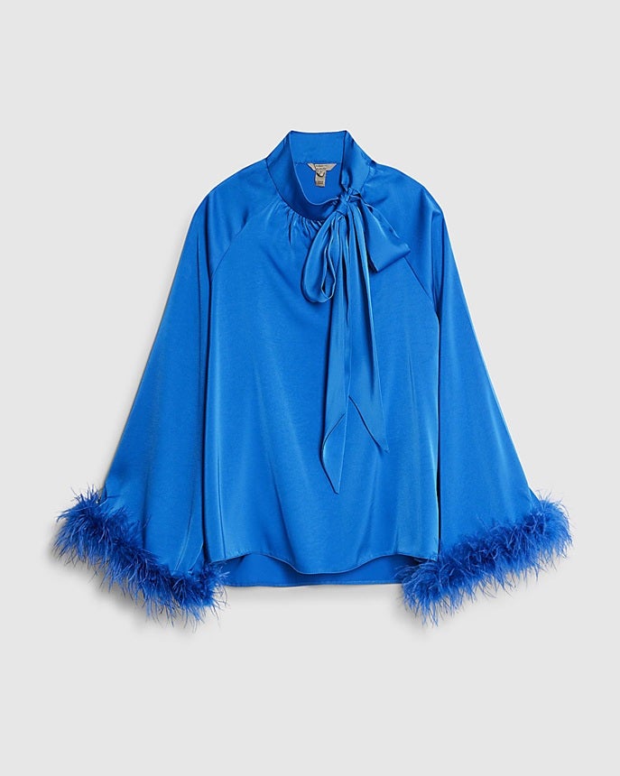 River Island Blue Satin Long Sleeve Feather Blouse, £26 (was £49)