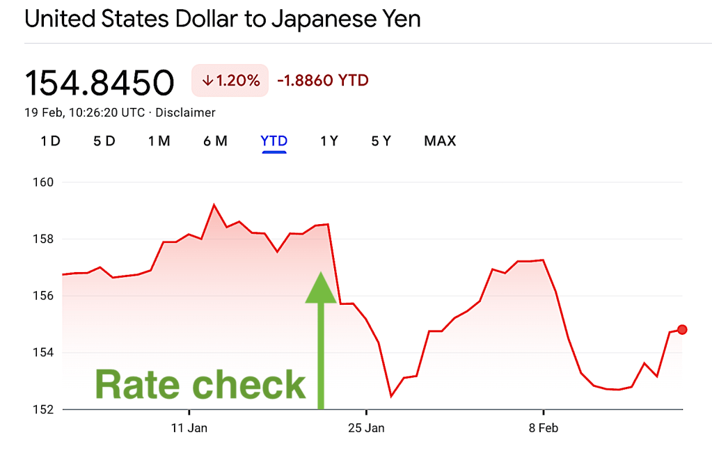 Indeed, that is exactly what happened on the foreign exchange markets on Jan. 23 of this year. The dollar had been trading at ¥158.50 but then collapsed suddenly to ¥152.45 by Jan. 27—a relatively sharp move for such large international currencies.