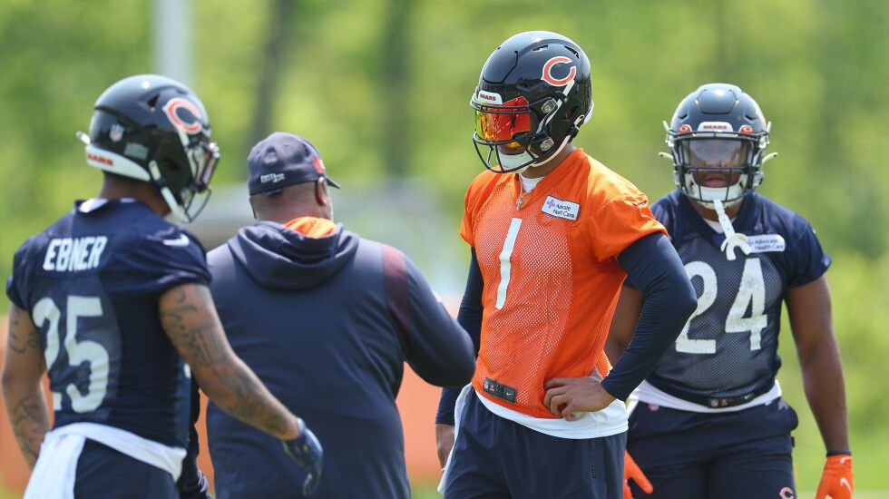 For Fields, who was facing no rush in team and 7-on-7 drills, it was a day to work on handoffs to Khalil Herbert and D’Onta Foreman, swing passes to Herbert and Khari Blasingame and easy throws to tight ends Cole Kmet, Robert Tonyan and Chase Allen on check-downs and crossing routes.