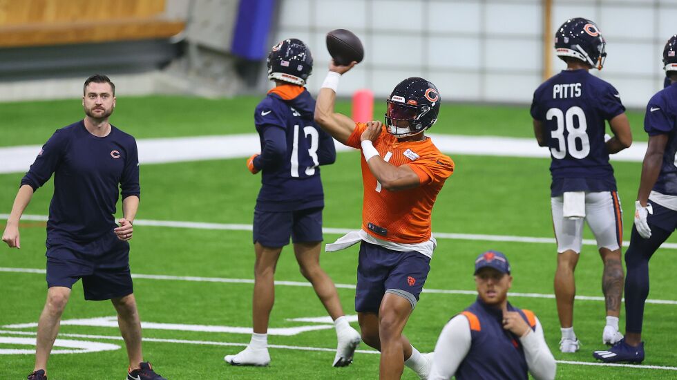 Fields threw an interception to safety Adrian Colbert in seven-on-seven drills. Earlier, Fields threw too early down the seam to Tonyan, and watched receiver Darnell Mooney — who was more active than he’s been all week as he recovers from an ankle injury — fail to make a difficult one-handed grab in the end zone.