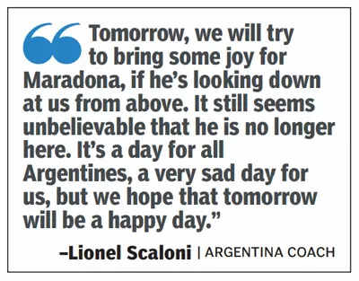 “Tomorrow, we will try to bring some joy for Maradona, if he’s looking down at us from above,” coach Scaloni, presenting a brave front, said. “It still seems unbelievable that he is no longer here. It's a day for all Argentines, a very sad day for us, but we hope that tomorrow will be a happy day,” he added.