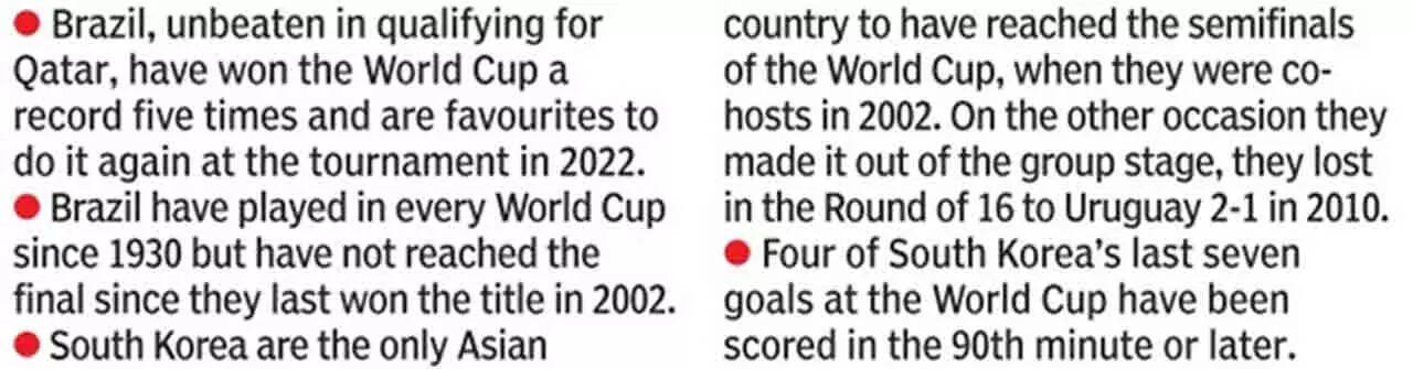 Pre-tournament favourites and the most successful team in the history of the competition with 5 titles, Brazil play their first knockout match of Qatar 2022 early Tuesday morning India time. The current number 1 team in the FIFA rankings will take on a team ranked 27 places below them - South Korea - in their Round of 16 match.