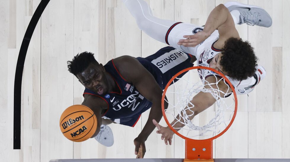 After his sixth three-pointer in an 82-54 blowout of Gonzaga in the Elite Eight, the Huskies’ Jordan Hawkins popped the front of his jersey.