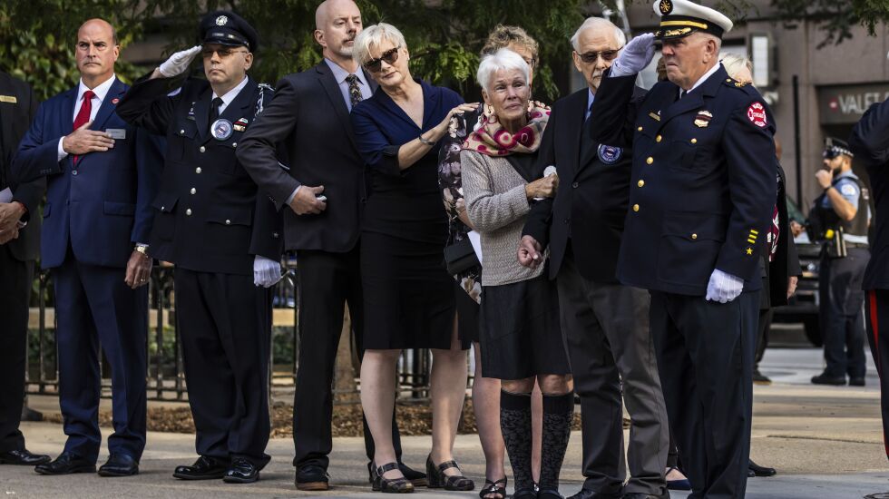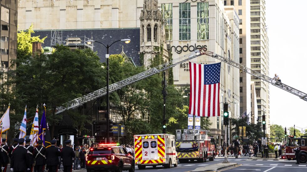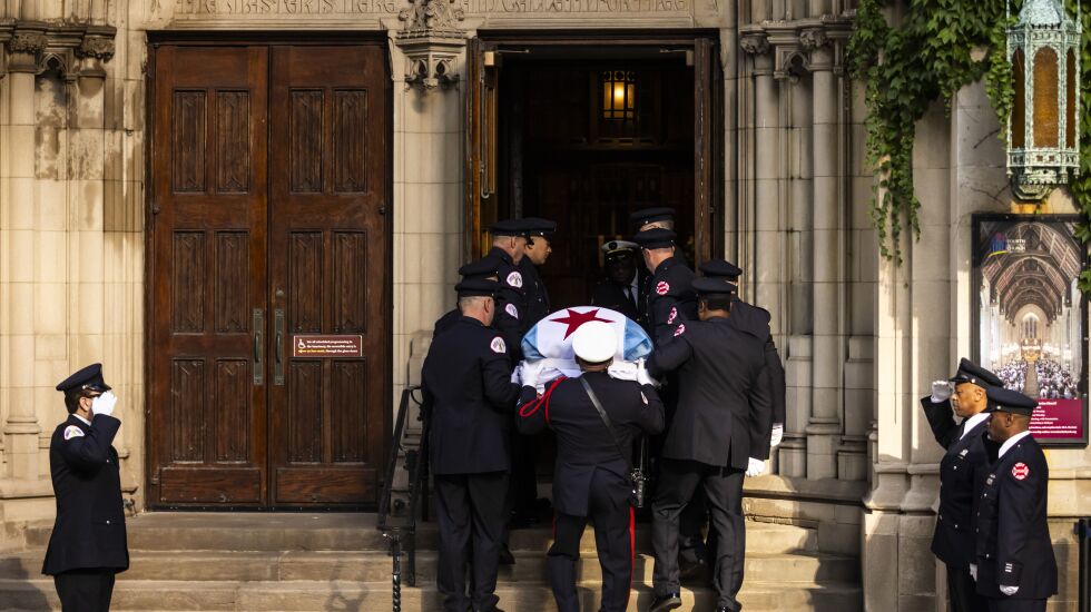 Firefighters and Chicago police officers lined up and saluted as the procession made its way to the steps of the Fourth Presbyterian Church for visitation and funeral services.