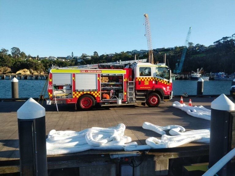 Fire and Rescue NSW crews have deployed absorbent oil booms into the water with the assistance of the harbour master.