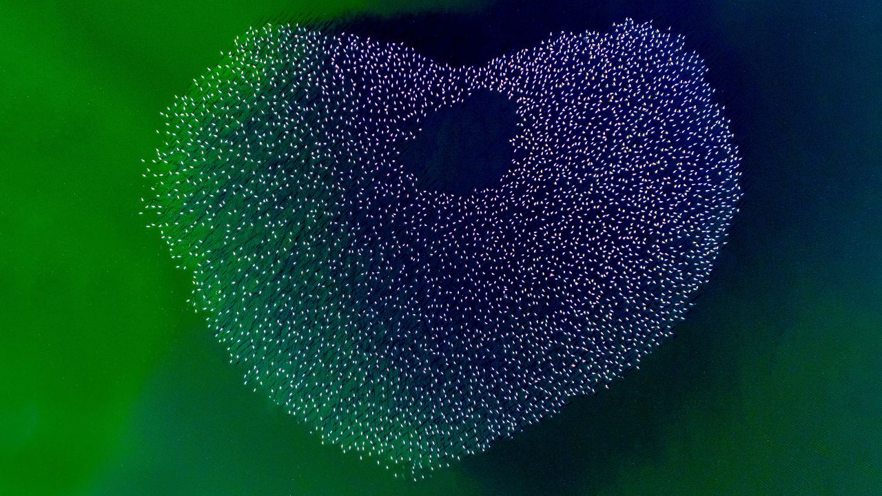 Captured by photographer Muzaffer Murat İlhan, the image Heart shows hundreds of flamingos gathered in synchronized motion over a vivid green-blue lake. What appears chaotic at ground level becomes extraordinary from above: a powerful symbol of love created by nature.