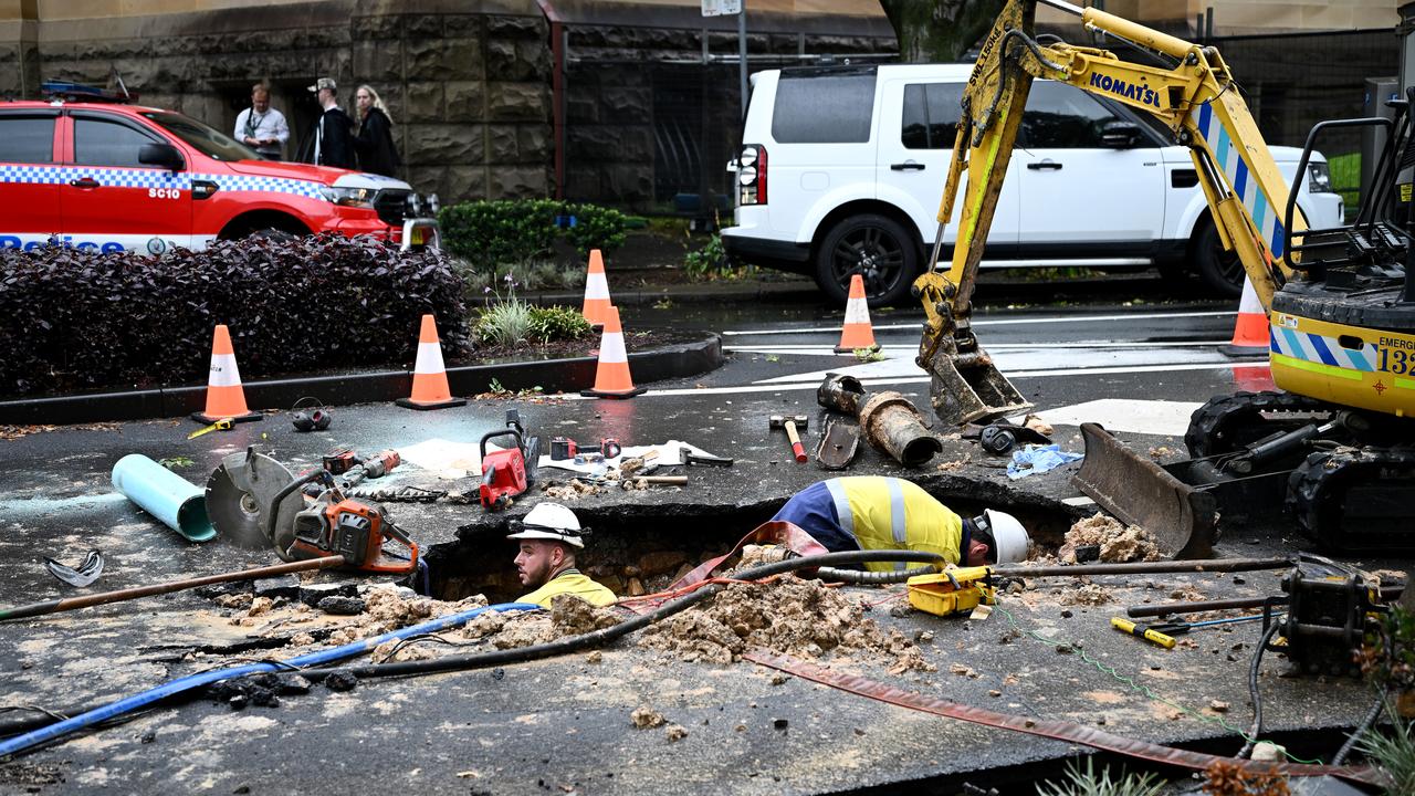 A sinkhole opened up in the Sydney CBD on Friday morning after rain pounded the city, with workers still repairing the damage at 2pm.