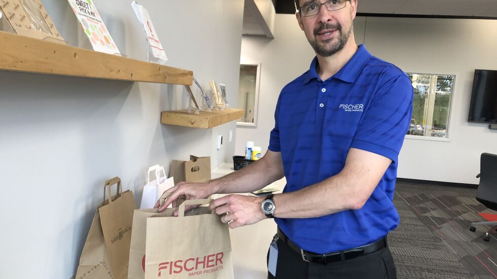 “Pulp comes from trees. Trees are brown,” said Joshua Fischer, showing off a standard grocery bag. “This is a natural craft paper, the natural color of the pulp turned to paper. whereas this is bleached to get white.”