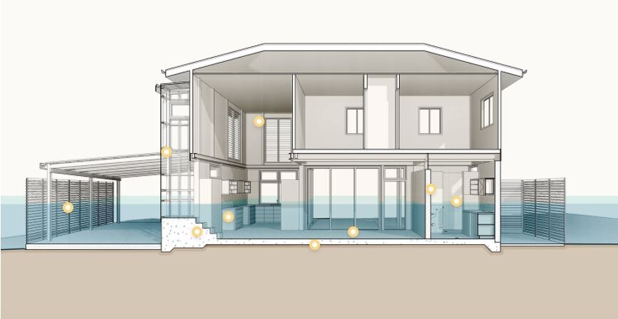 It also demonstrates how homes can be designed with spaces to lift important items higher when flooding starts, and styles of perimeter fencing to help floodwater flow away.
