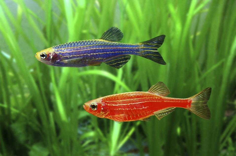 Although there now are a dozen or so species of bioengineered fluorescent fishes, the first GloFish created by scientists were zebrafish, Danio rerio, a small minnow that is roughly the size and length of a AA battery. Zebrafish are named for the silver and black (or are they gold and blue?) stripes that extend the length of their bodies. They are popular aquarium fish for beginners because they tolerate a wide variety of water conditions and temperatures. They also are common research model organisms in a variety of scientific disciplines, particularly for drug development and developmental biology where they have been used in genetic studies for decades (ref).