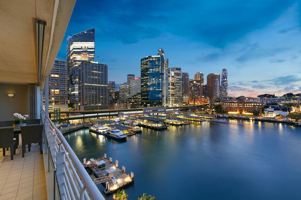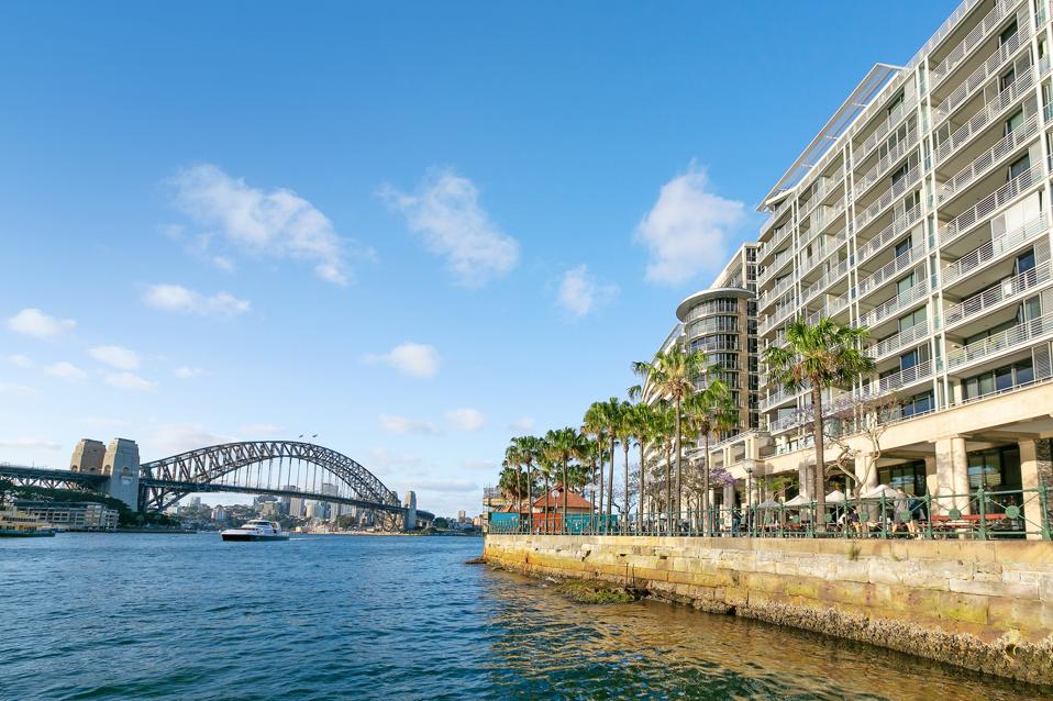 The views extend from the open kitchen and balcony, and an office. Residents of the Bennelong Apartments have access to a 24-hour concierge, as well as a pool, sauna,and gym.