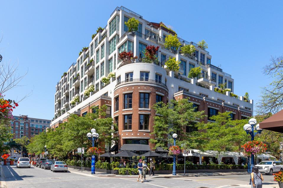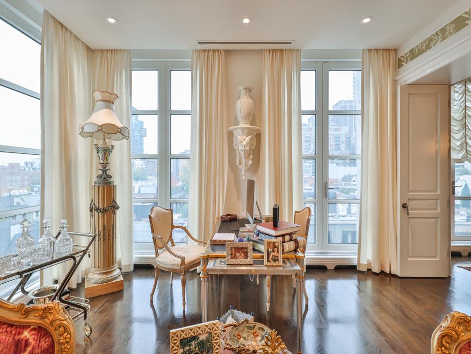 Purchase five-star hotel amenities with this penthouse at the Hazelton Private Residences, luxury condominiums atop The Hazelton hotel. Designed by Colette van Den Thillart in 2021, the 4,240-square-foot, three-bedroom home is served by a private elevator and features 10-foot ceilings, custom silk wall treatments and wide-plank walnut hardwood floors.