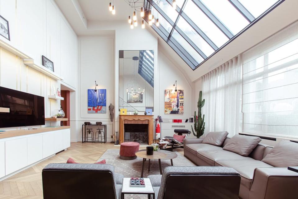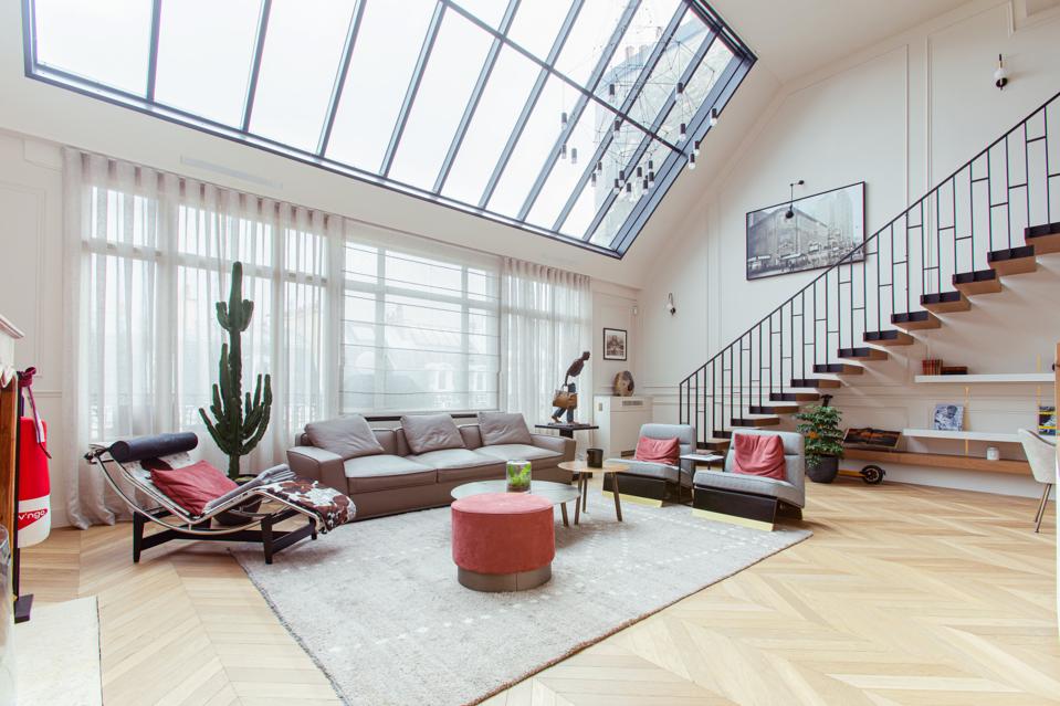 This three-bedroom penthouse apartment spans the sixth and seventh floors of an elegant 1910 building near the Bois de Boulogne.