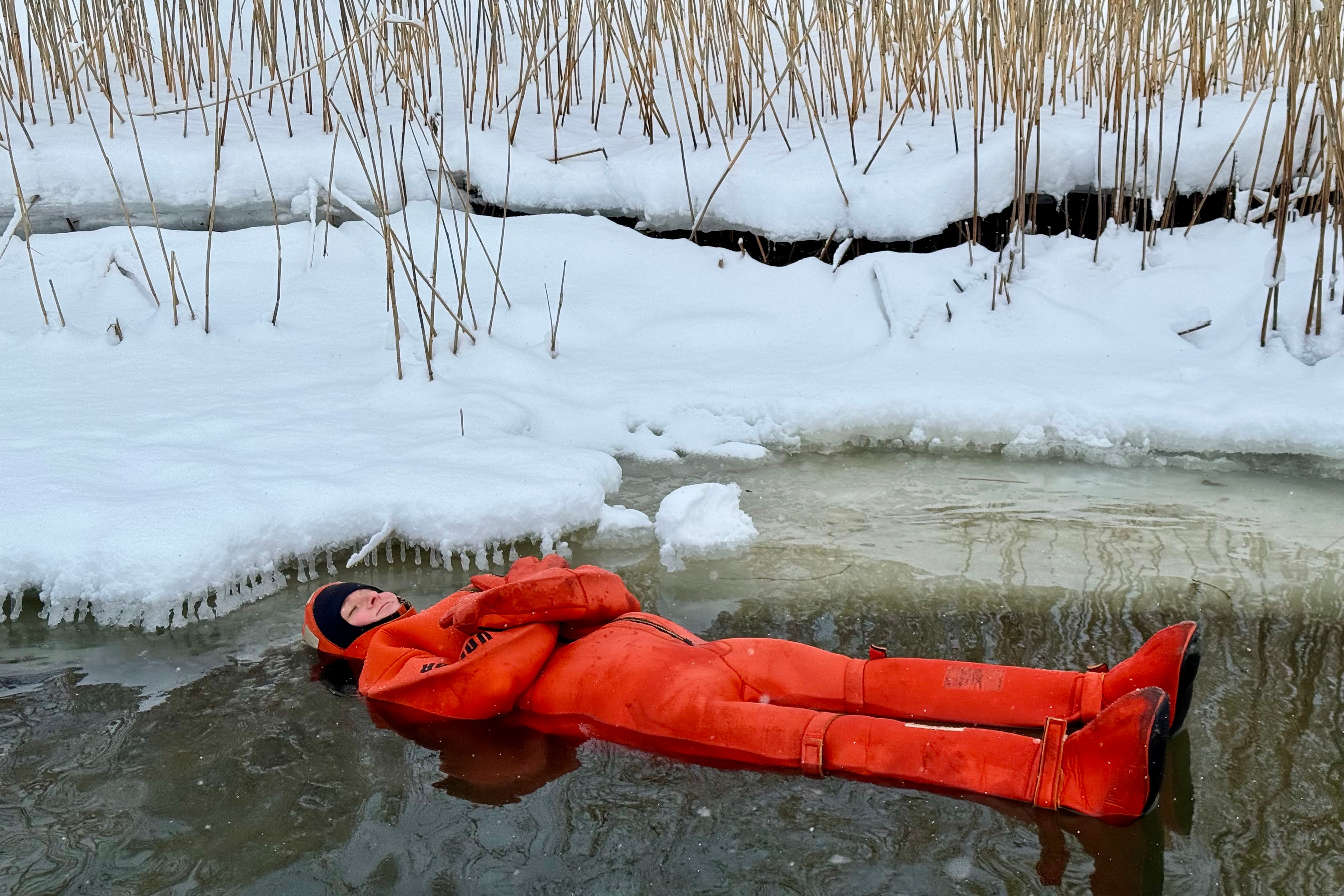 The fact that I’m in a deeply relaxed, almost meditative, state and not suffering with early stage hypothermia is because I’m fully kitted out in a bright orange neoprene survival suit. Used by the crew on ships and fishing boats in case of emergency at sea, these immersion suits are designed to maintain the wearer's body temperature and keep them buoyant for up to six hours in cold water.