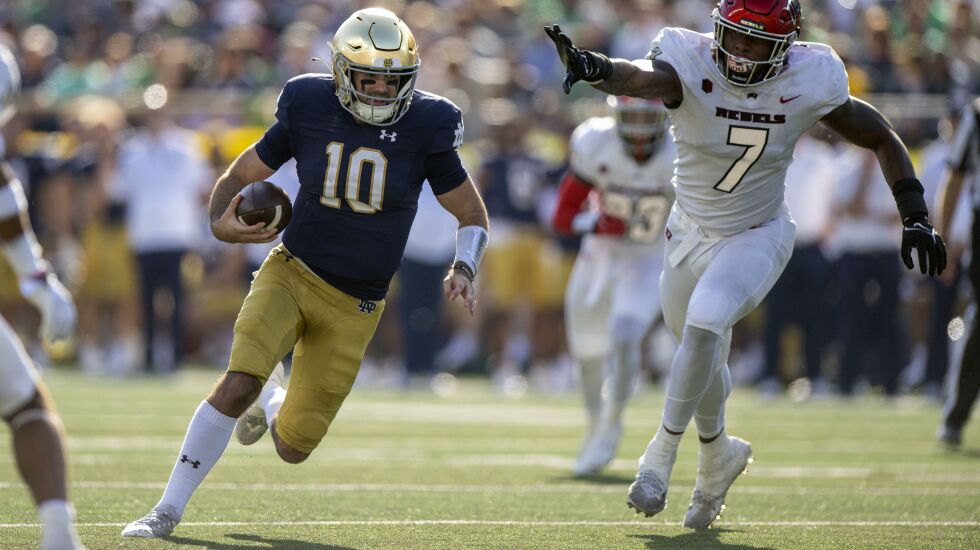 Notre Dame (4-3) hadn’t scored a first-quarter touchdown in its first six games, being outscored 27-6, but scored two on Saturday and added a three field goals by Blake Grupe to open a 23-7 lead. It was a familiar story for the Rebels (4-4), who lost their third straight and have been outscored 96-40 in the first quarter.