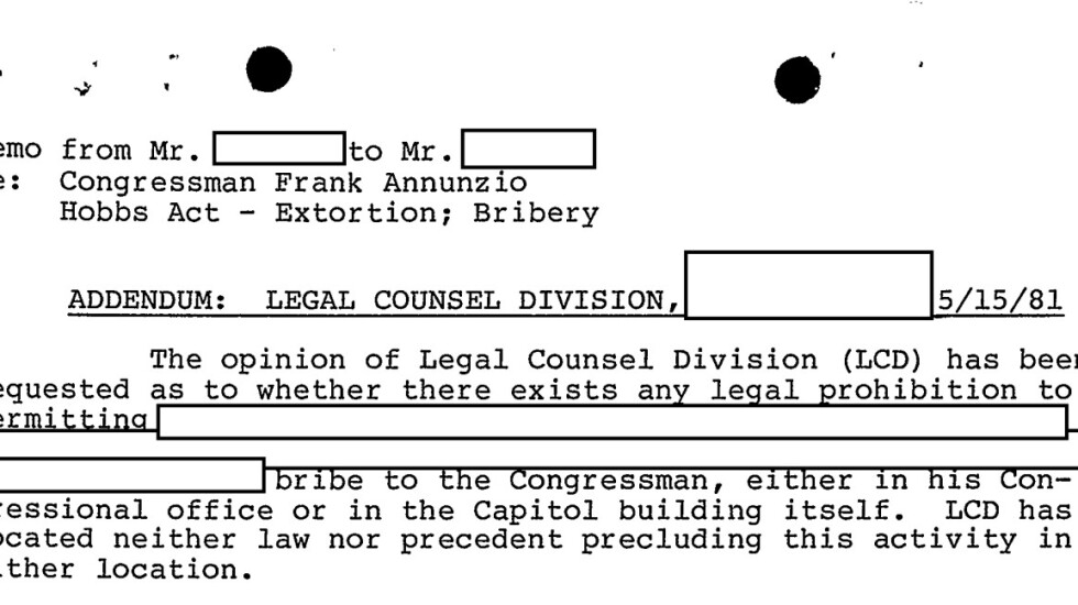 “The opinion of the Legal Counsel Division (LCD) has been requested as to whether there exists any legal prohibition to permitting [REDACTED] bribe to the congressman, either in his Congressional office or in the Capitol building itself,” says an FBI memo from 1981. “LCD has located neither law nor precedent precluding this activity in either location.”