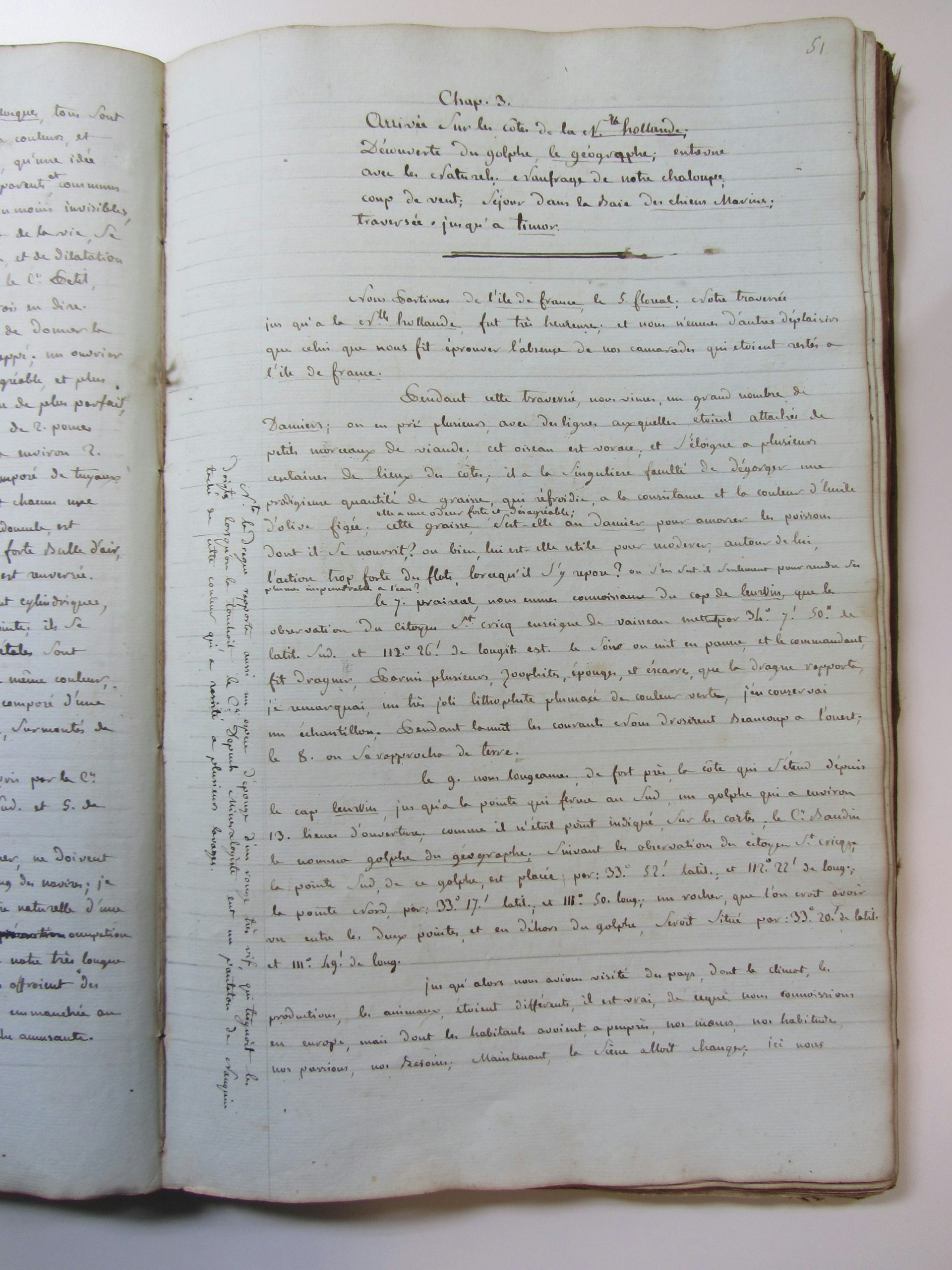Prior to this I had been working on a translation of the only version of the journal thought to exist, an incomplete copy made for the navy by an unknown hand. But then, in late 2016, out of the blue, the original journal in Leschenault’s own handwriting was put up for auction in Royan on the west coast of France. Where the journal had been for the previous 200 years was not revealed.