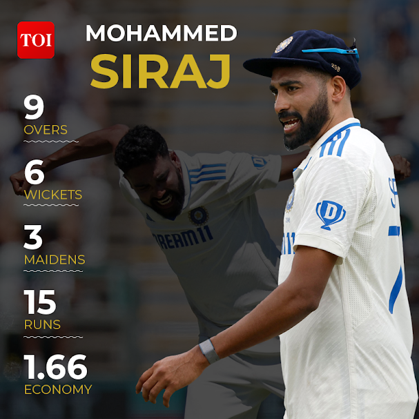Siraj's Fiery Spell: Mohammed Siraj emerged as the hero of the day with a career-best performance, claiming a remarkable 6/15 in South Africa's first innings. His sublime display of pace and precision wreaked havoc on the Proteas' top and middle order.