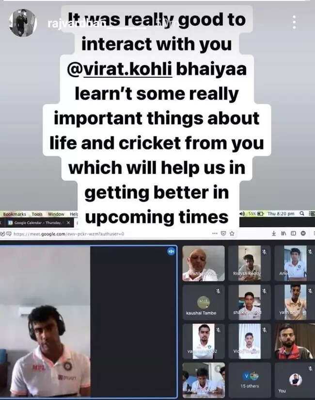 "It was really good to interact with you Virat Kohli bhaiyya. Learnt some important things about life and cricket from you which will help us in getting better in upcoming times," wrote team's premier pace-bowling all-rounder Rajvardhan Hangargekar on his instagram stories.