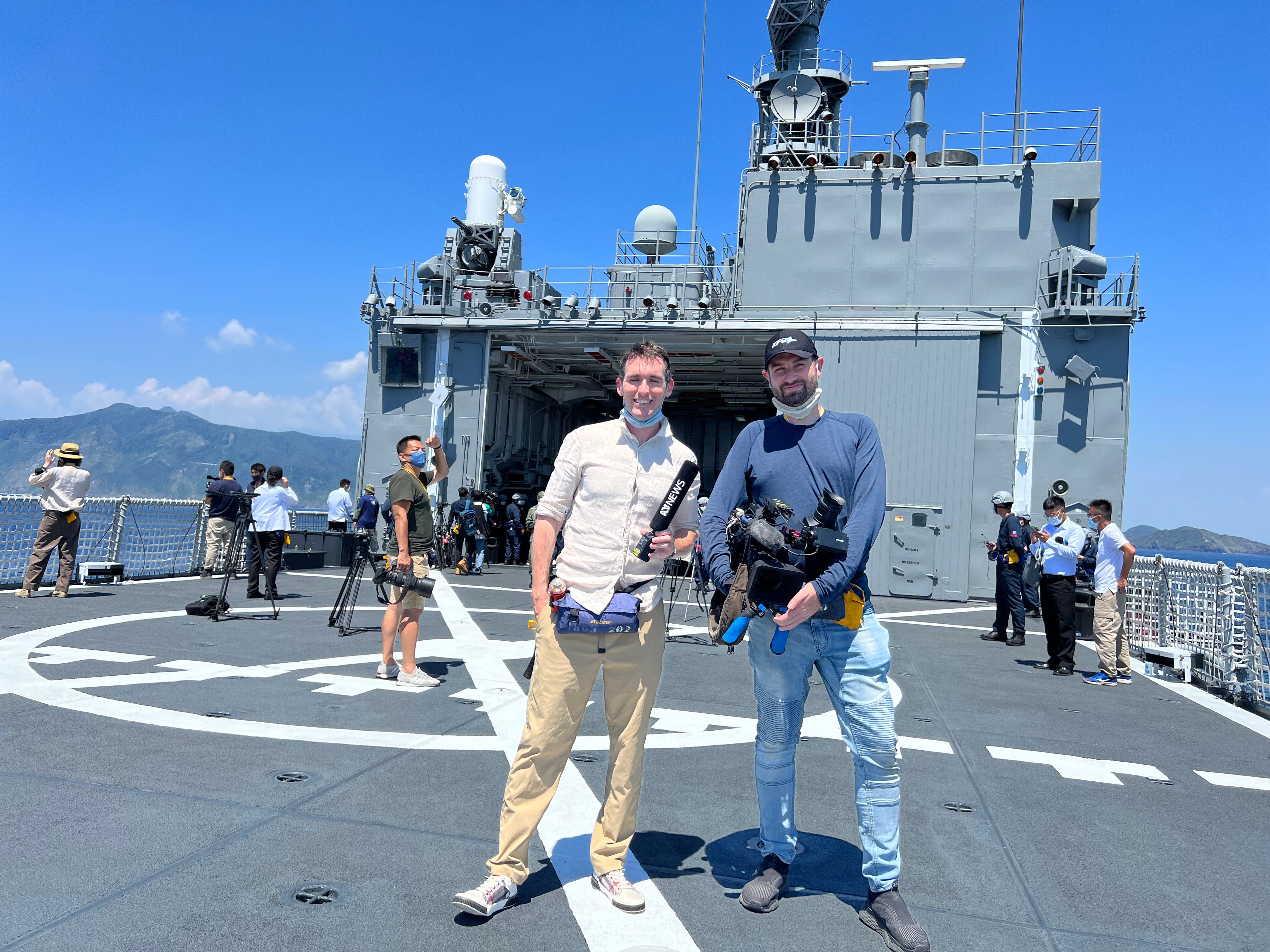 On board a Taiwanese naval ship with camera operator Mitchell Woolnough. (Supplied: Bill Birtles)