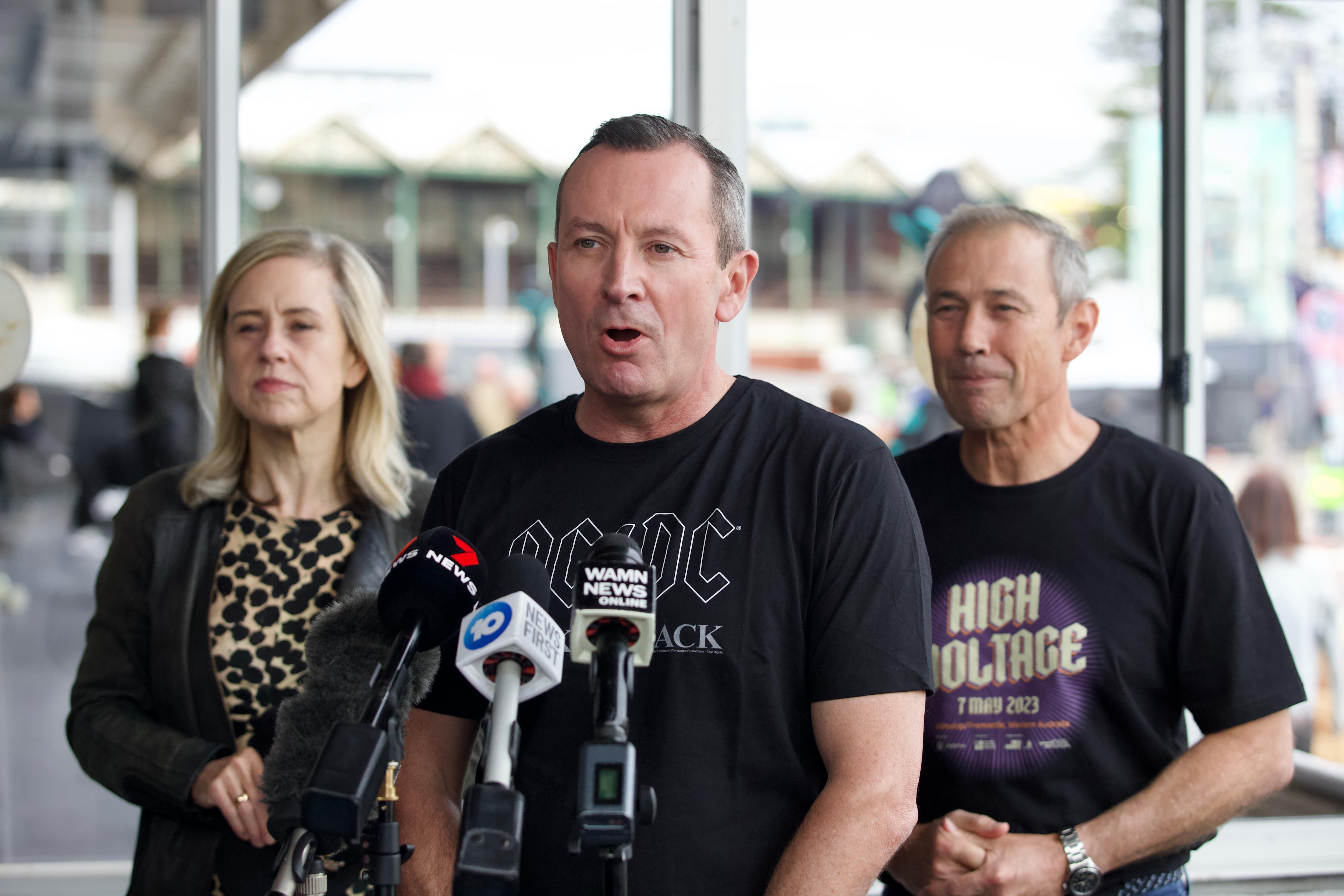 Premier Mark McGowan donned a black AC/DC shirt as he spoke at the start of the free event, taking the opportunity to make light of yesterday's coronation of King Charles.