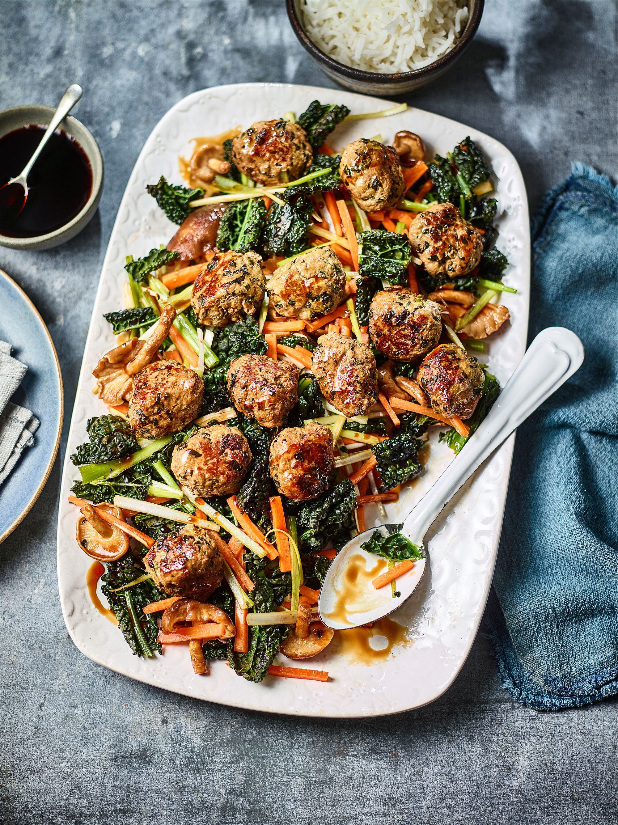 Give a classic a Japanese twist with these teriyaki pork meatballs, packed with savoury-sweet flavour and deep umami richness. Serve with a crispy cavolo nero salad and wholegrain basmati rice.
