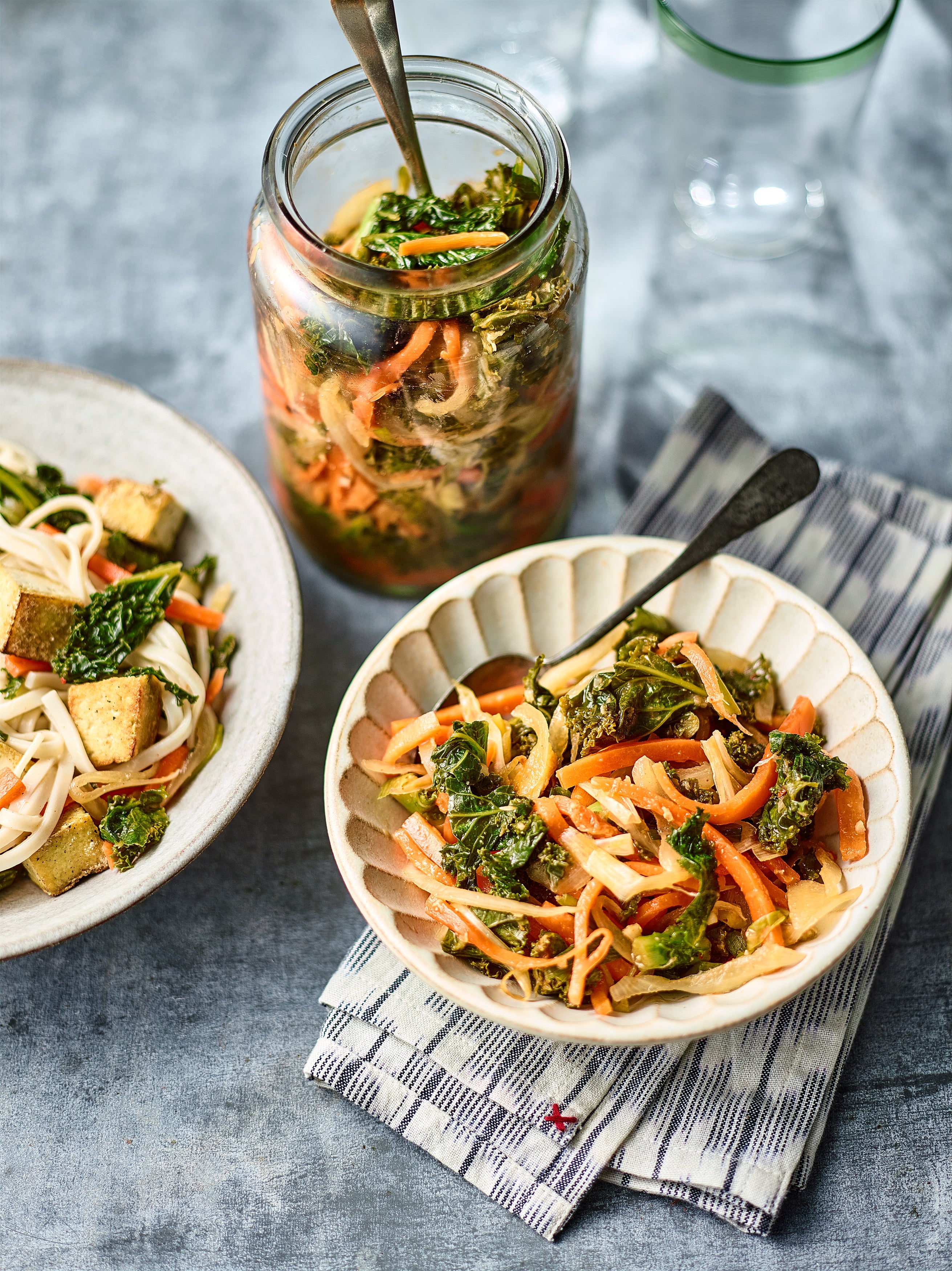1. Place the kale, carrots and onion in a large bowl. Shred the green parts of the spring onions and mix them into the kale. Sprinkle over the salt and mix in with clean, dry hands to evenly coat. Leave in the fridge for 6 hours, but ideally overnight.