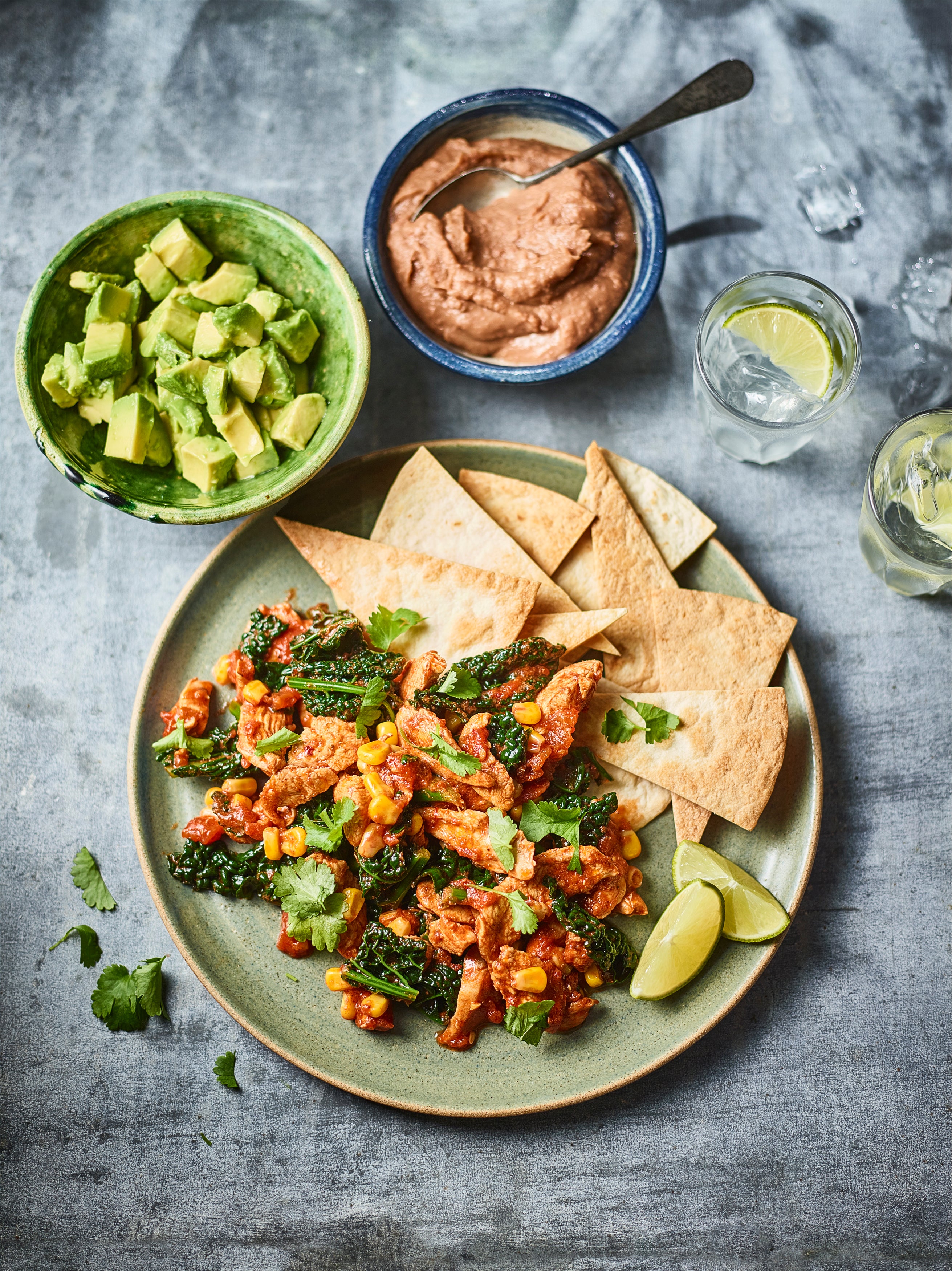 Rich, smoky, and slightly spicy marinated chicken, served with vibrant and tasty cavolo nero, chopped tomatoes, diced avocado and homemade tortilla chips – a colourful dish delivering a taste of Mexico.
