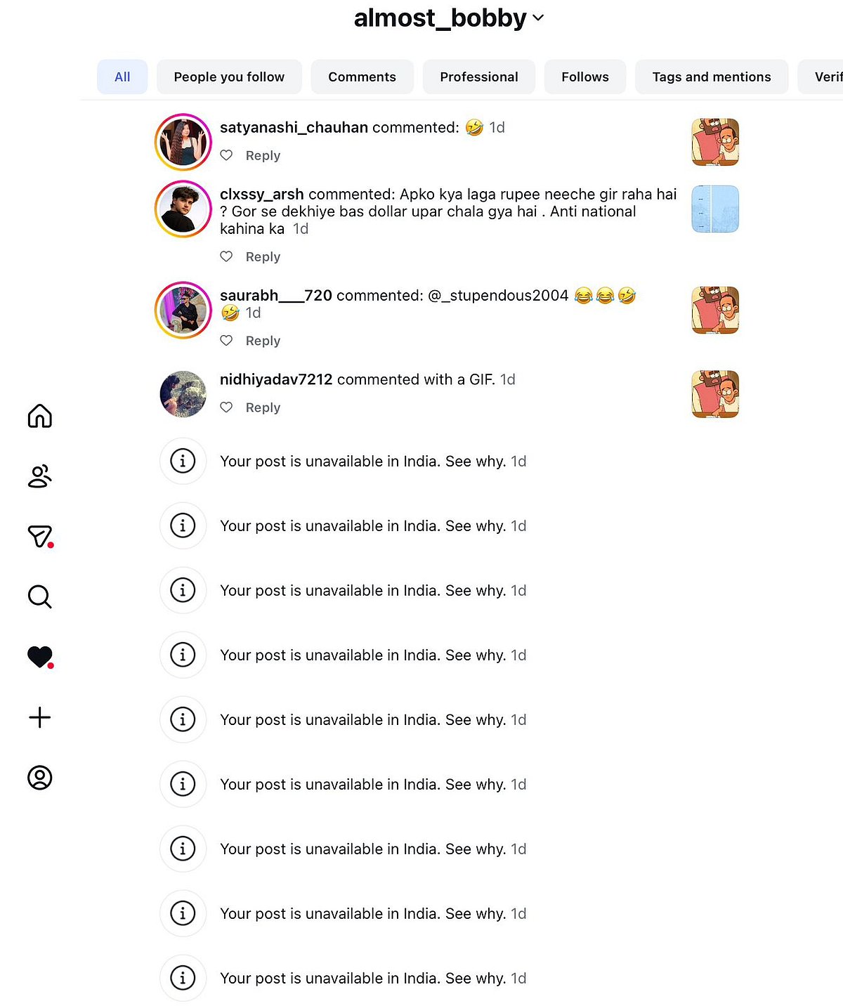 Two Kolkata-based illustrators who go by the pseudonyms Bob and Bobby also had seven Instagram reels restricted in India on January 28 following what the platform described as a legal request from Haryana law enforcement.