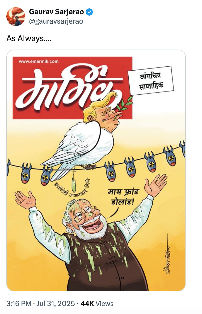 Sarjerao, a freelance cartoonist and president of the Cartoonist Combine, has contributed cover illustrations to the Marathi weekly Marmik for five years. In July 2025, he created a cartoon featuring Prime Minister Narendra Modi and US President Donald Trump for the magazine’s cover. On August 1, 2025, he posted an animated version of it on Instagram. The video received 21 lakh views and was shared 1.5 lakh times.