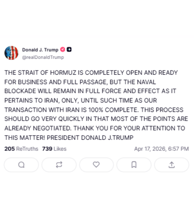 “The Strait of Hormuz is completely open and ready for business and full passage, but the naval blockade will remain in full force and effect as it pertains to Iran, only, until such time as our transaction with Iran is 100% complete. this process should go very quickly in that most of the points are already negotiated,” said Trump.
