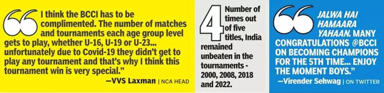 Despite little age-group cricket in India for the past two seasons due to Covid-19, the India under-19 team notched up a nine-game unbeaten run, clinching two back-to-back tournaments. "It was an outstanding achievement by the boys. Hats off to them for winning two major tournaments - the Under-19 Asia Cup (in UAE) and then the World Cup in span of a month. Considering that we had hardly two-three months' time to prepare, it's a great achievement," India Under-19 chief selector Sridharan Sharath told TOI on Sunday.
