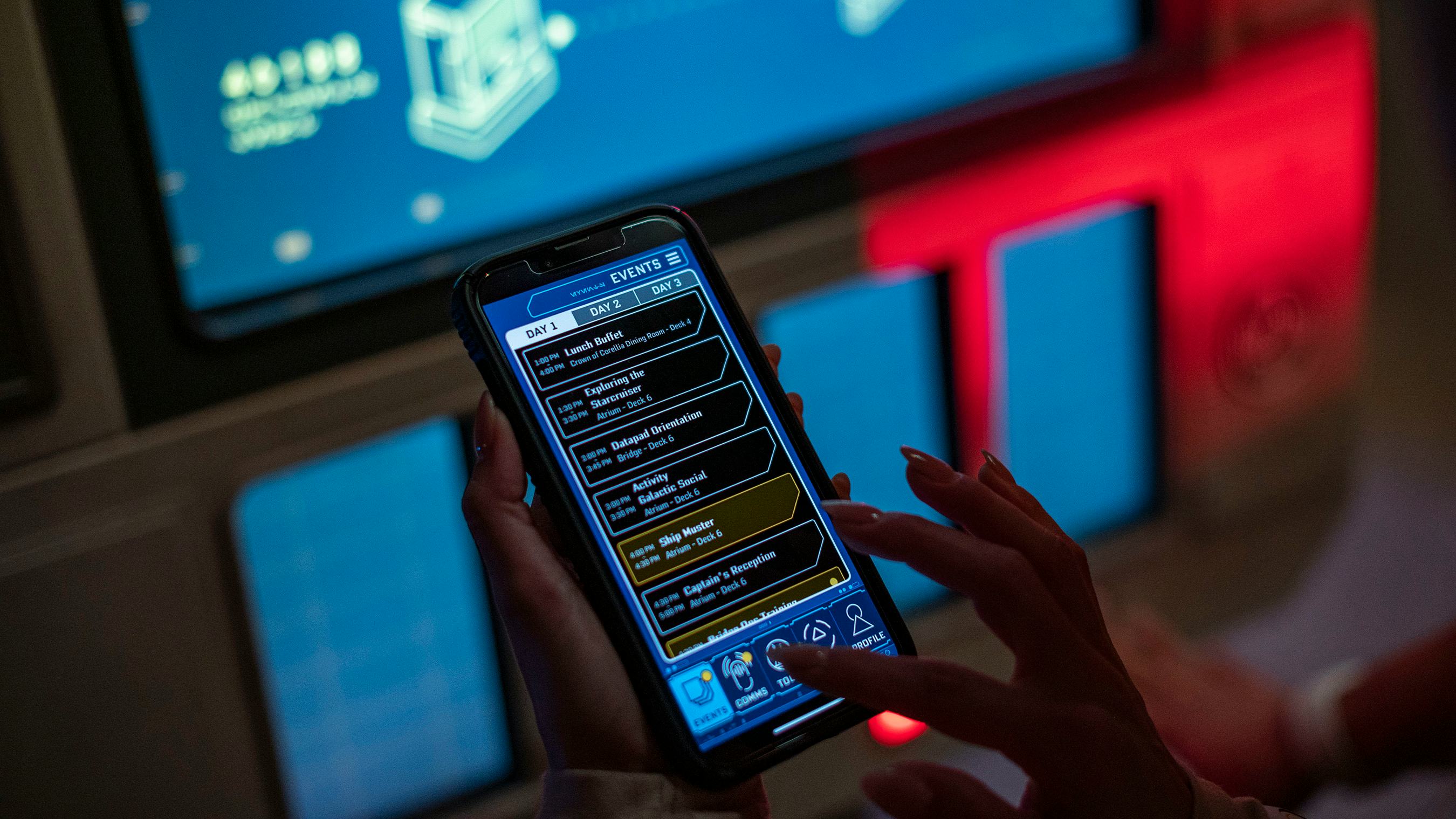 It all comes back to your datapad — your mobile device — and the Play Disney Parks App. Previously, the app’s best-known use has been to keep kids engaged while waiting in line for rides. Aboard the Halcyon, it becomes a Star Wars-themed PalmPilot with the ability to collect tools, receive comms from characters aboard the ship, and look at your space cruise itinerary.