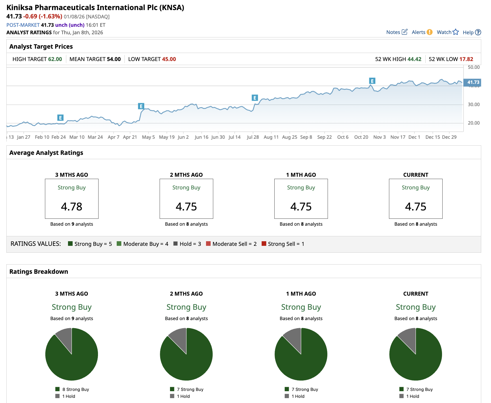 Out of the eight analysts covering KNSA stock, seven recommend “Strong Buy,” and one recommends “Moderate Buy.” The average KNSA stock price target is $54, below the current price of $42.