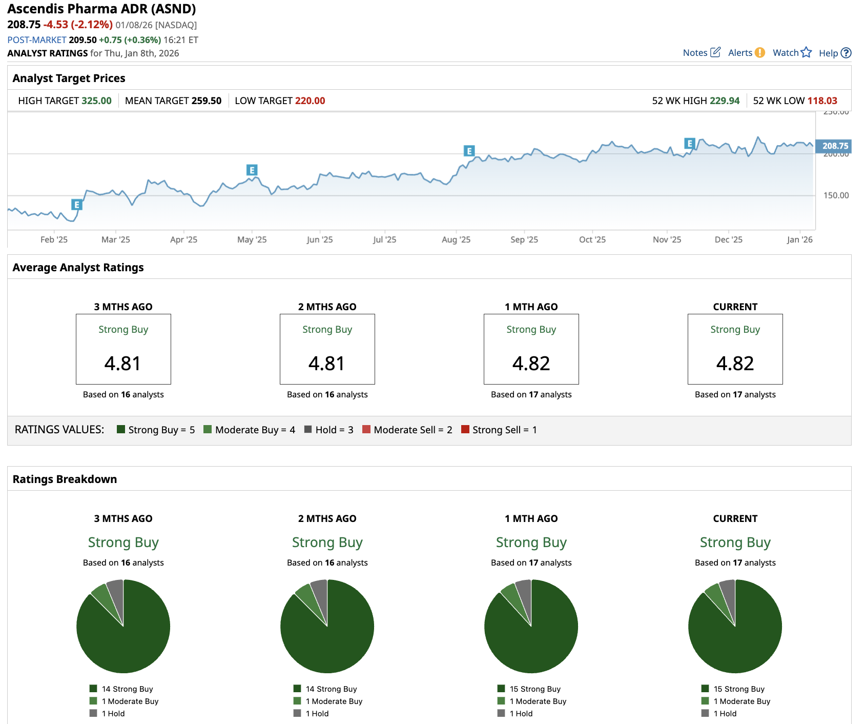 Out of the 17 analysts covering ASND stock, 15 recommend “Strong Buy,” one recommends “Moderate Buy,” and one recommends “Hold.” The average ASND stock price target is $259, below the current price of $209.